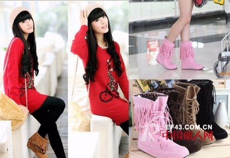 流苏靴是今年非常流行的款式,长长短短、或繁或简,搭配几米图案的长款毛衣,在视觉上牵引人的视线,非常有流线感。