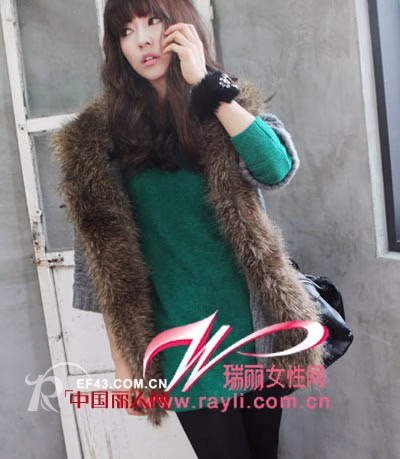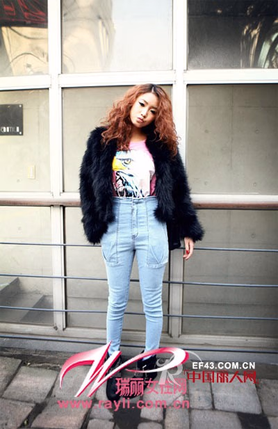 皮草娃娃衣,前面还有两个小绒球装饰,搭配高腰牛仔裤,个性十足!!