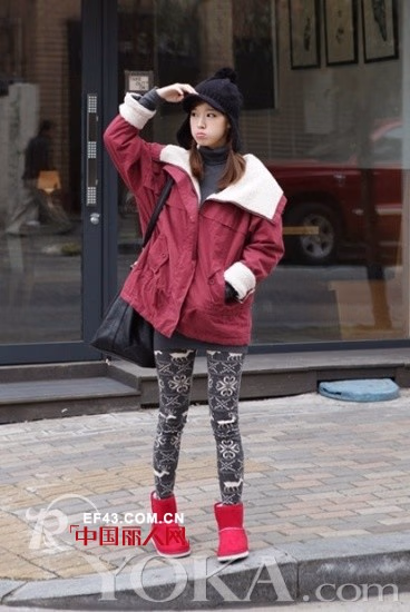 一条花纹连裤袜搭配雪地靴是不错的选择,外套与靴子同色相呼应,整体显得丰富又不会过乱。