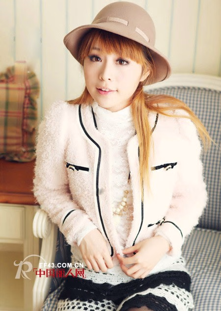 钻扣烟花小外套,粉色打底镶上经典的黑色织带,雪纺毛边与烟花呢的绒感相应成趣,复古的感觉再现,是这个季节里你的最爱。