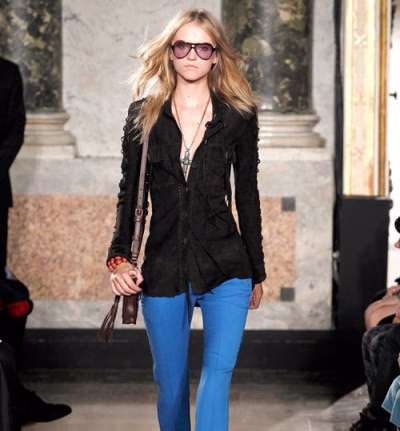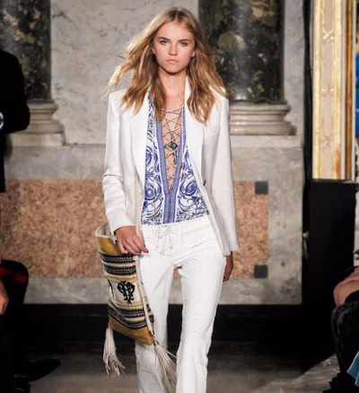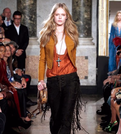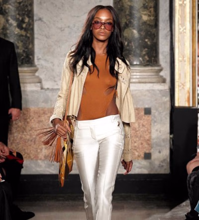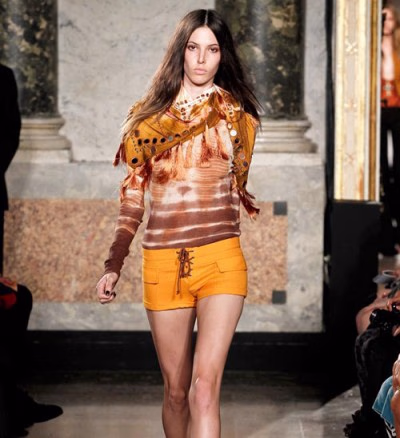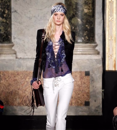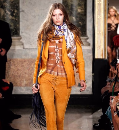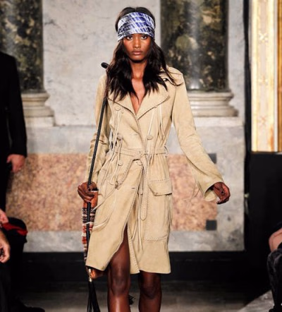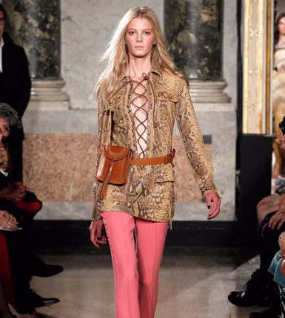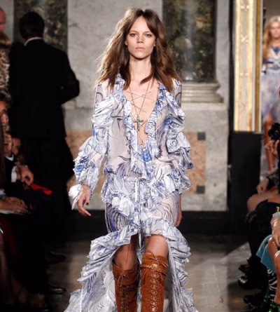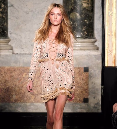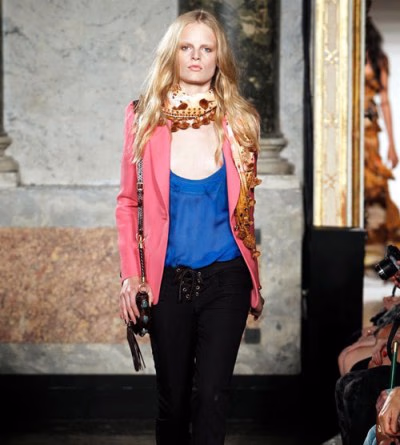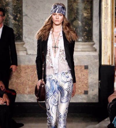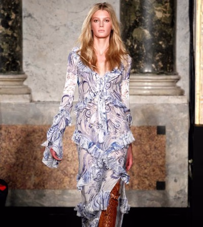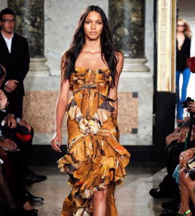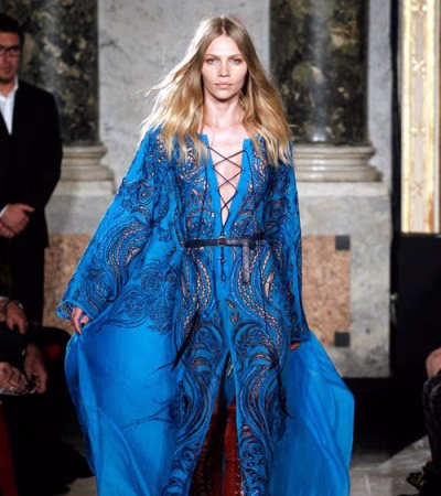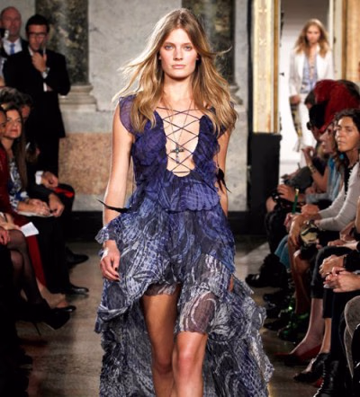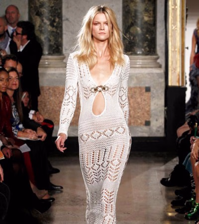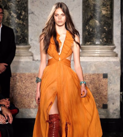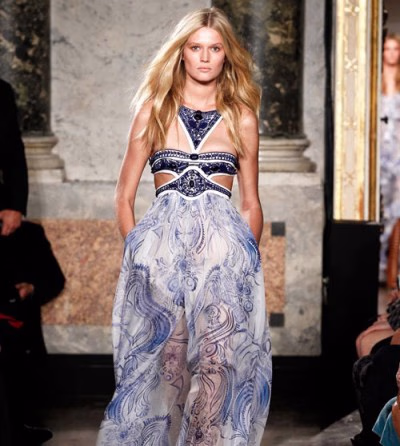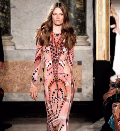 璞琪(Emilio Pucci)2011春夏女装中的曳地长裙借鉴了希腊长袍的式样,通过层叠的褶皱和收腰的款式更加突出身材曲线,高开叉和前短后长的剪裁,让修长的双腿和露趾绑带高筒靴完美展现。长袖紧身长裙看似保守,却因为腰部的镂空剪裁而有了泳装般的视觉效果,裙身上圆点形的图案是镶嵌上去的小块镜片,干练洒脱之中仍是传达着女性内在的性感魅力。