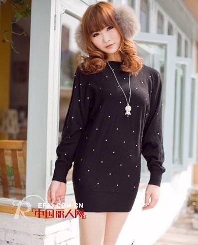 日系风的蝙蝠袖整件衣服都贴满小钻,一字领设计在秋冬依然能小露一下香肩和优雅的脖子。