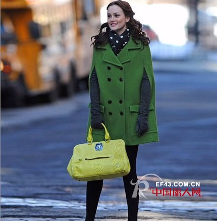在初冬的街头,身着绿色斗篷衣搭配鹅黄绿手包,和嫩绿色高跟鞋,相信一定会令枯燥的季节生机盎然。