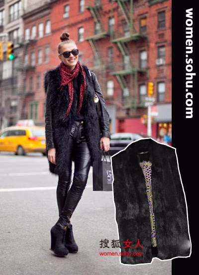 皮草马甲搭配皮质legging,帅气十足,再加上今年特别流行的坡跟短靴,超级有范儿!