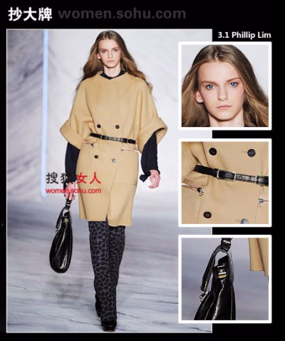 时尚解析:受上世纪70年代风潮影响,Phillip Lim本季也狂迷上迪斯科与朋克风格,驼色羊毛风衣,宽大的版型、自然垂肩的设计,都强调了一种大女人的气场,是OL日间着装的最佳选择。
