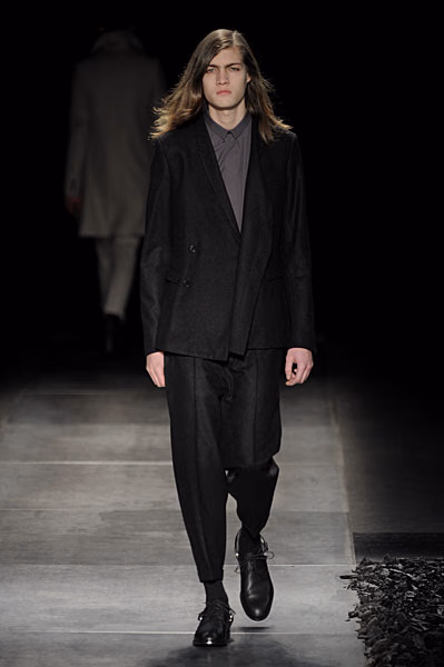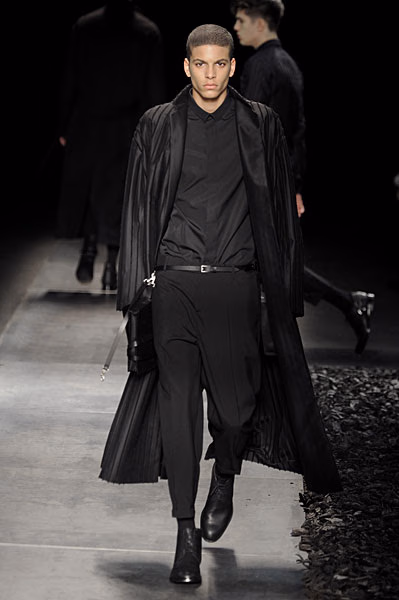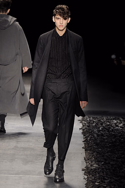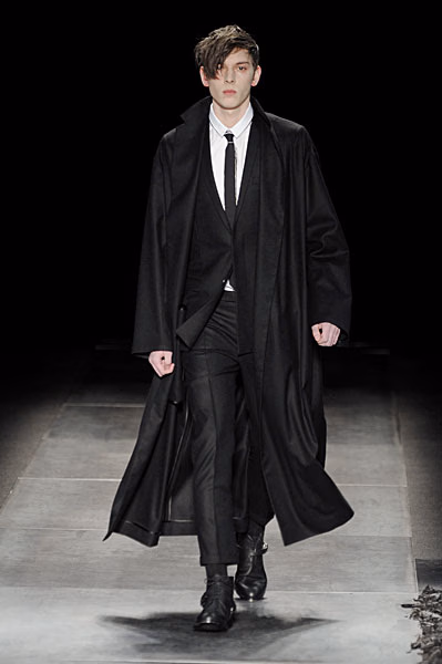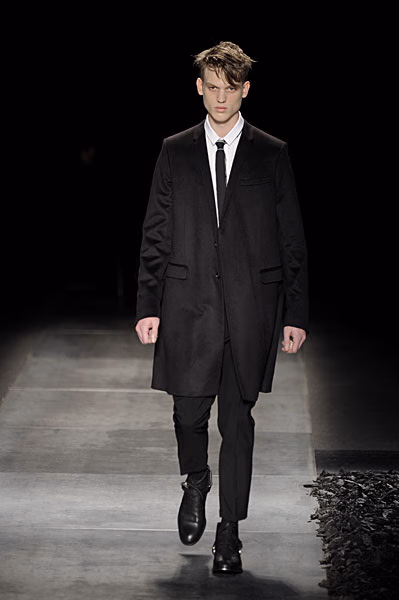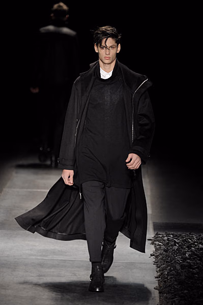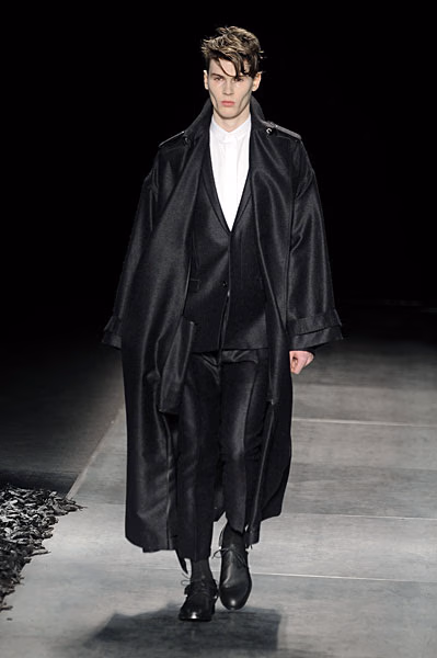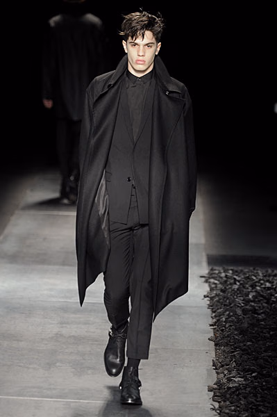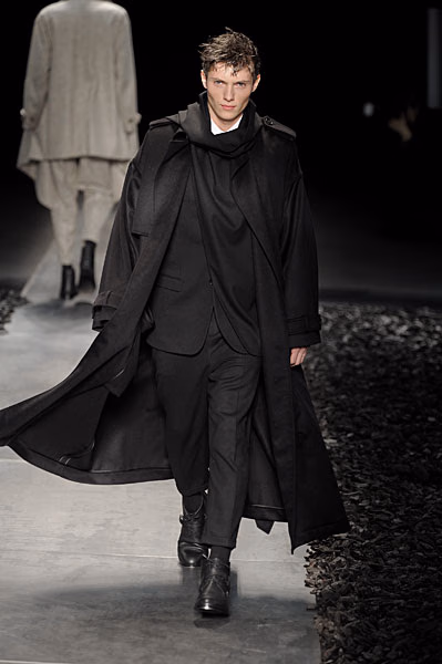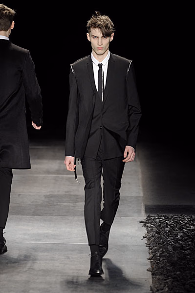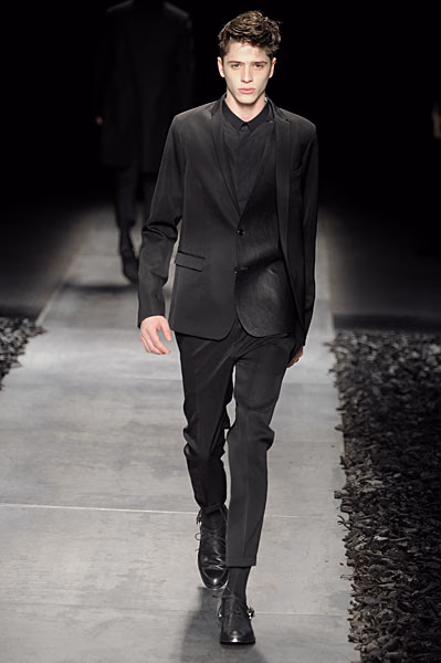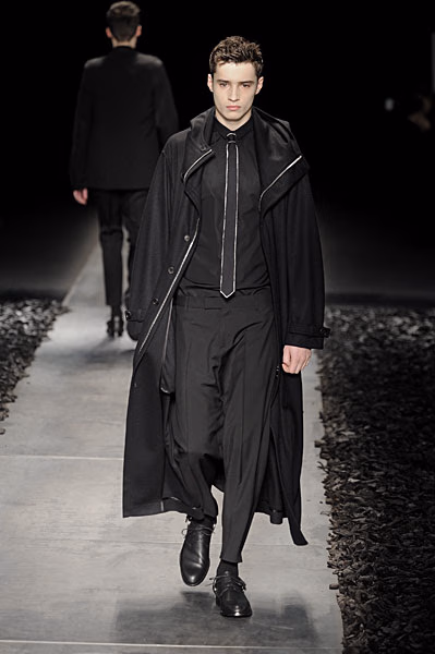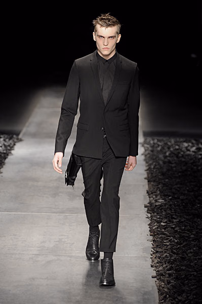 你很难理解为什么Dior Homme如此的火热,就连时尚大帝Karl都无法抵挡他的诱惑。时尚的诠释,其实就是这样,Dior Homme的男装设计无不体现着对于时尚潮流的诠释。而酷感十足的冷峻设计风格似乎又将Dior Homme带回了那个曾经让Karl情迷的吸血鬼装。本季Dior Homme的设计中,主要以黑色的设计为主,在本季的设计中,设计师Gareth Pugh尝试用流畅的男装版式,来将男装应有的优雅感觉表现出来,这就使得Dior Homme不同于其他设计——拥有了流畅的曲线感,当然,这种设计在男装领域里确实也是不多见的。很显然,借助于纯色的表现,Gareth Pugh本季的创造非常成功。