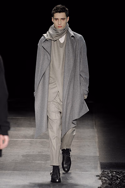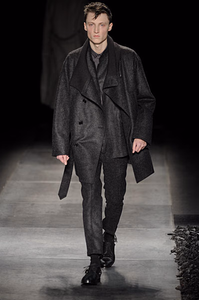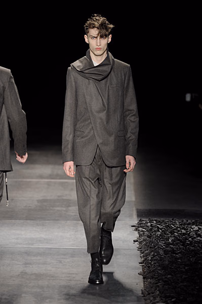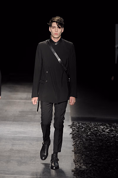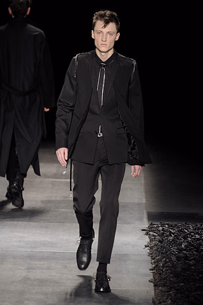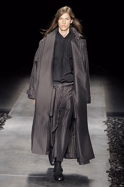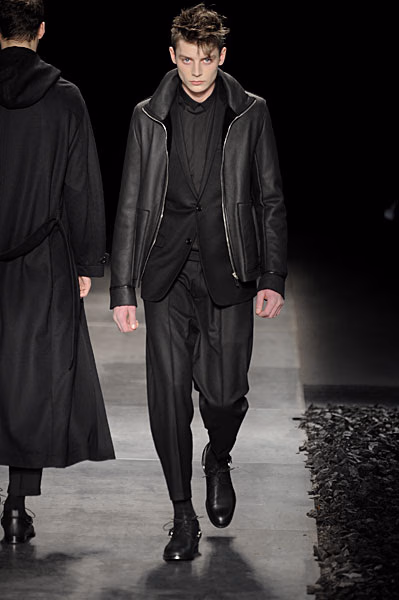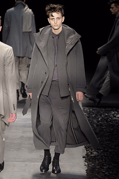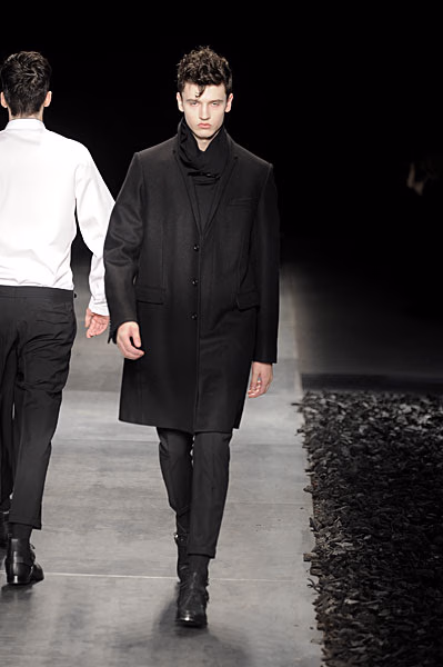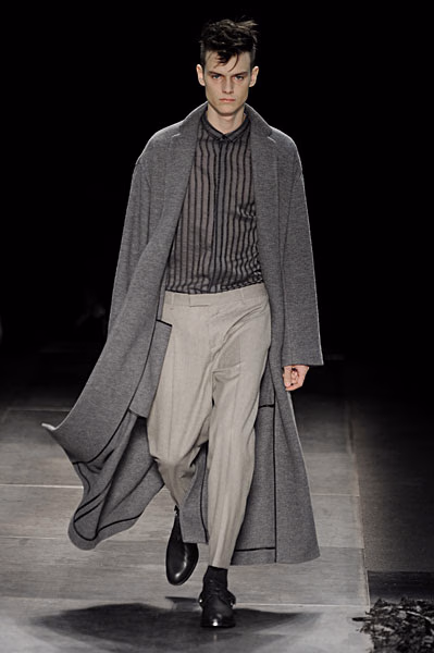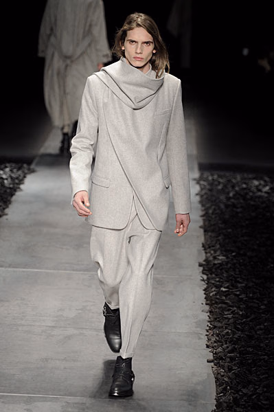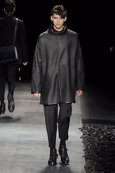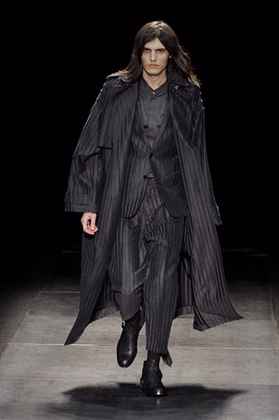 你很难理解为什么Dior Homme如此的火热,就连时尚大帝Karl都无法抵挡他的诱惑。时尚的诠释,其实就是这样,Dior Homme的男装设计无不体现着对于时尚潮流的诠释。而酷感十足的冷峻设计风格似乎又将Dior Homme带回了那个曾经让Karl情迷的吸血鬼装。本季Dior Homme的设计中,主要以黑色的设计为主,在本季的设计中,设计师Gareth Pugh尝试用流畅的男装版式,来将男装应有的优雅感觉表现出来,这就使得Dior Homme不同于其他设计——拥有了流畅的曲线感,当然,这种设计在男装领域里确实也是不多见的。很显然,借助于纯色的表现,Gareth Pugh本季的创造非常成功。