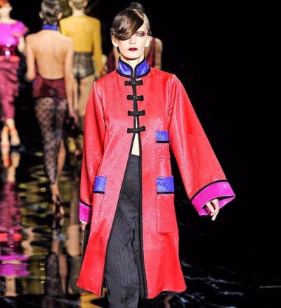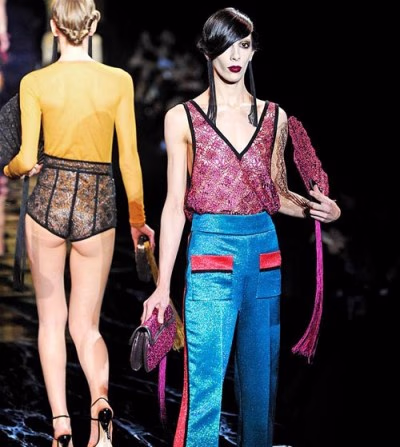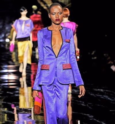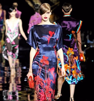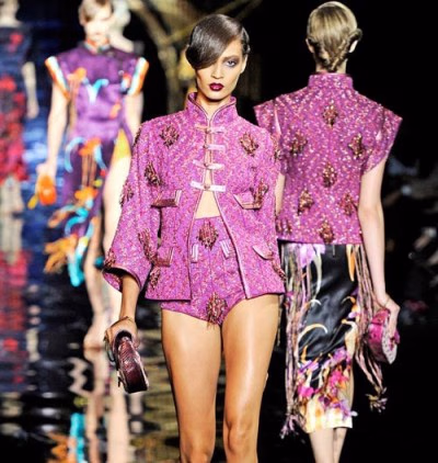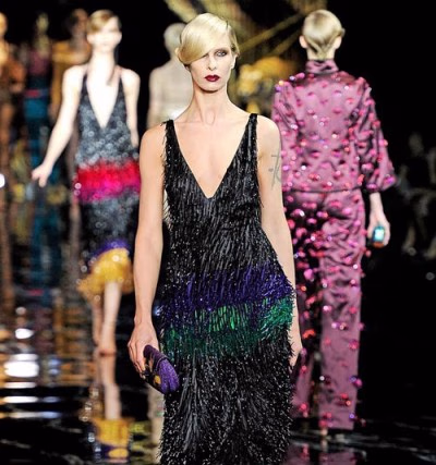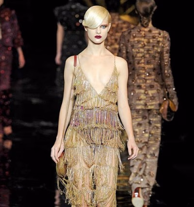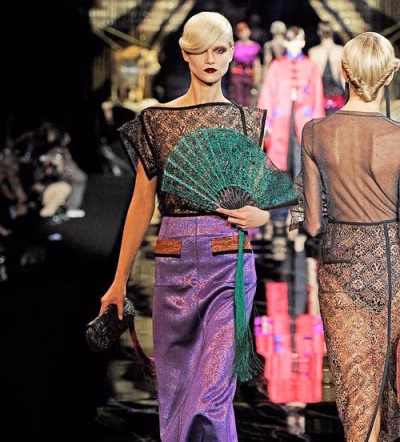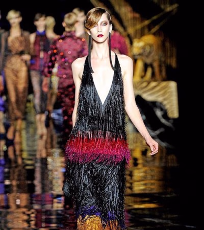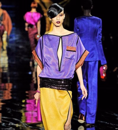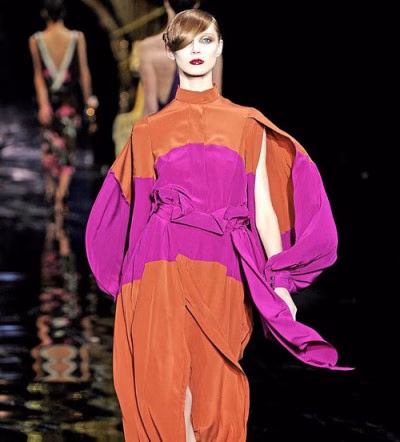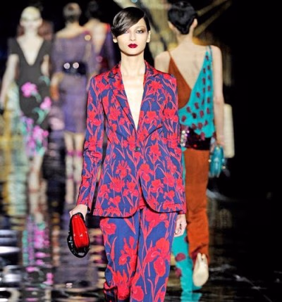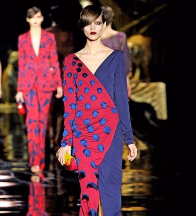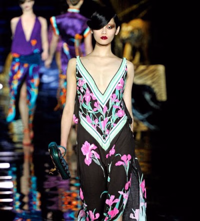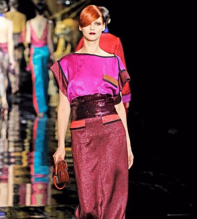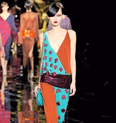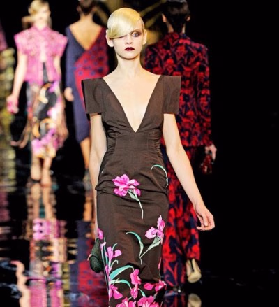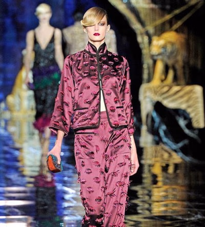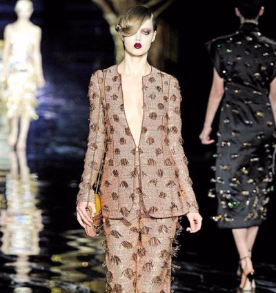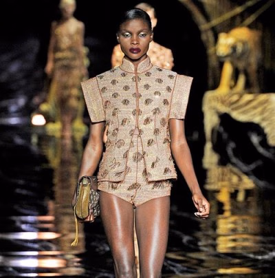小马哥带来的LV (LOUIS VUITTON) 2011春夏女装秀和他自家的品牌马克·雅可布 (Marc Jacobs) 这一季的设计有着几分相似,都是复古风情的新诠释,也都运用了夺目的色彩来展现华丽与风情。不同之处在于小马哥大胆的将兽纹元素融入LV (LOUIS VUITTON) 女装设计中,令人眼前一亮。