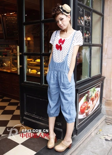 蓝色个性背带裤搭配白色圆点可爱蝴蝶结T恤,休闲可爱的邻家女形象!