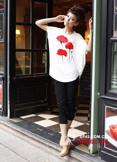 白色蝙蝠袖T恤搭配黑色7分裤,时髦性感高街女郎