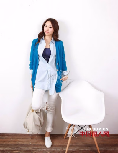 天蓝色男友式衬衫搭配中长款开衫,穿出了潇洒的味道。错扣的纽扣带出了顽皮的味道,随意的衬衫衣角显得休闲自然。