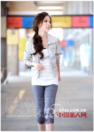 浅灰色的短版小外套,也是搭配白色T恤,下面配上同色系深灰色的打底裤。看上去颜色搭配的很协调,整体感觉很自然,是秋初比较适合的颜色。