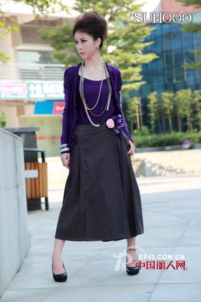 初秋的幽思也可以让心头的那份幸福如此平静的炫彩绽放,深邃的幽思紫色很适合初秋的思念,内衬绽放的荷叶边,甜美魅惑,连缀的一条伸缩褶皱领子,同色系不会显得繁复更显深意,后背褶皱层叠拼接,三颗晶亮纽扣的装饰,似乎在诉说遥远美丽的思念,质地轻柔的舒适质感,更添愉悦幽思。