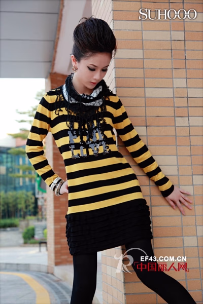 东方的含蓄娇羞美感在此刻的小女人味中怡然流光溢彩,黑黄的经典横纹,缀以蛋糕裙的下摆,也嵌入了一份神秘的女人味,黑色珠片的装饰,打破单调的同时更显高档品质,领口的几抹娇羞褶皱,正映衬了徐志摩的“最是那一低头的温柔,省却人间无数的娇羞”。