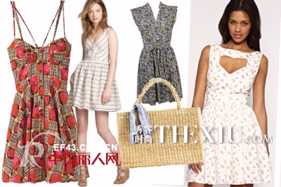 上图从左往右:Rachel Comey 吊带裙;J. Crew 蓝色条纹裙, $168;Forever 21 针织印花裙;Wanderlust 编织手提袋;Rare 碎花心型开口裙。