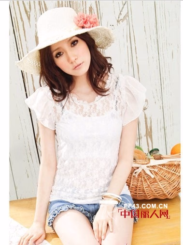 荷叶袖蕾丝T恤搭配花边短裤,甜美性感。
