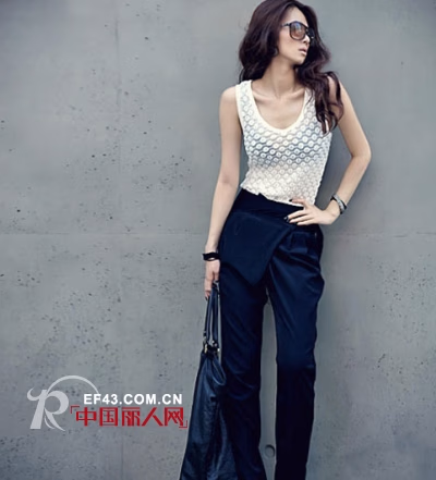 轻纱质地的背心具有透视感,但不会太出挑,很适合OL们。黑色九分裤是双腿变得修长,而下身黑色的搭配也很好的中和了背心带来的过分轻盈,变得稳重许多。