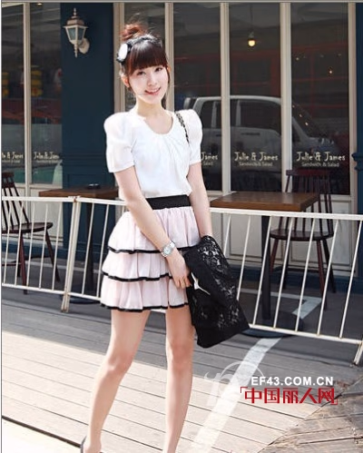 浅粉色3层裙摆的可爱短裙,黑色的镶边增添成熟魅力。