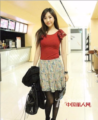 惹人喜爱的小碎花高腰短裙搭配略带成熟的暗红色修身T恤塑造魔力女人味!