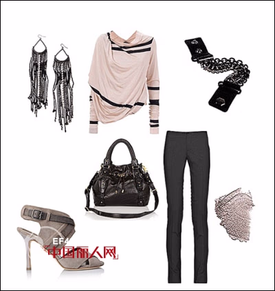 裸色蝙蝠袖衬衫搭配黑色西装裤透露出强大的女王气场,搭配抓绒高跟凉鞋更加新颖,皮质包包提升个人质感和时髦度。