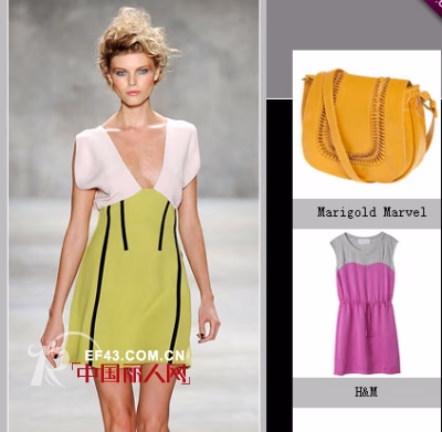 镶拼款式的假两件连衣裙让黄色和白色融为一体,简单的款式加上不同的色块马上就有了层次感和细节感,搭配罗马凉鞋更加丰满。