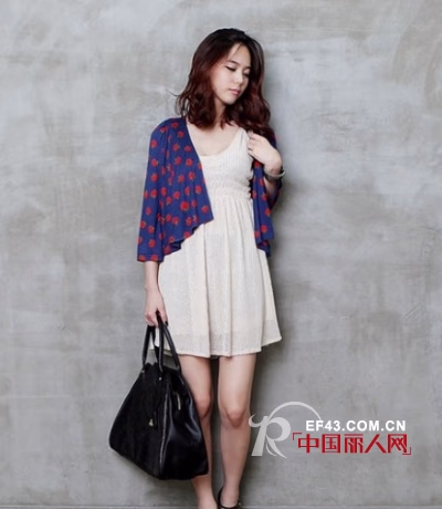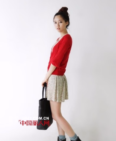 米色碎花小裙,搭配红色小开衫,带走你的呼吸。
