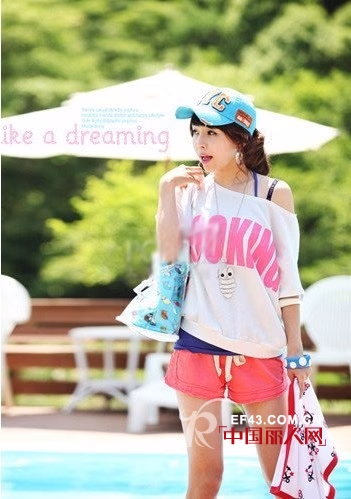时尚点评:粉嫩的糖果女孩!超阔领字母白T,宽松而自然,内搭系颈背心,露出小女孩般的可爱。MM身上枚红色的短裤也甜的发腻,劲吹韩国少女风。