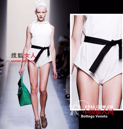 设计师Tomas Maier笔下的Bottega Veneta,衣饰轮廓永远的Clean & Simple,不落俗套。在这一季,还原服装面料本有的质感和颜色,以棉麻质地为主打,纯白和浅黄色贯穿始终。连身短裤的立体剪裁和倒三角形的设计是整身Look的亮点。腰间的黑色腰带加强了整个造型的立体感,让极简的风格更为强烈。