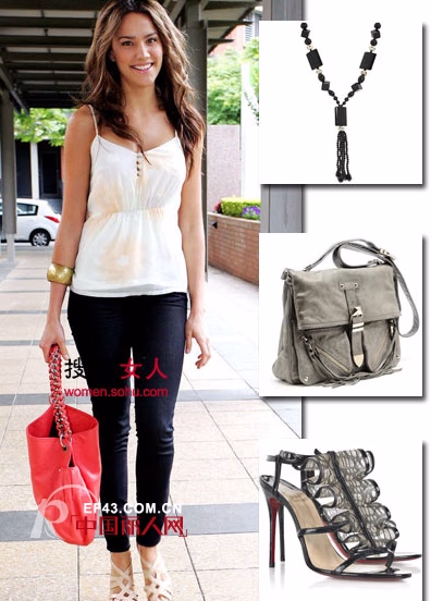 白色吊带衫,收腰的设计,平凡中的不简单。配对黑色铅笔裤,简约的款式,经典的色彩,舒适养眼。红色皮包点缀,俏皮可人!
