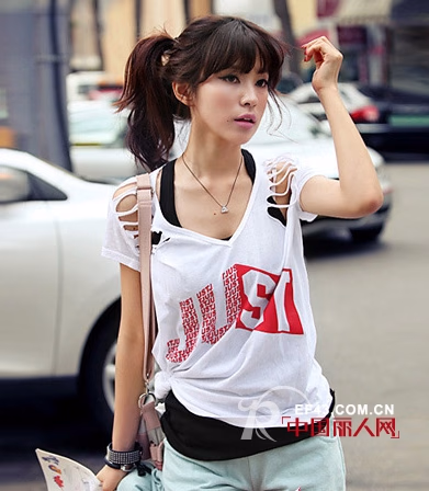 个性破洞字母甜美T恤,高贵中透出点小性感,吸引眼球