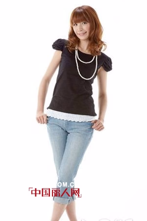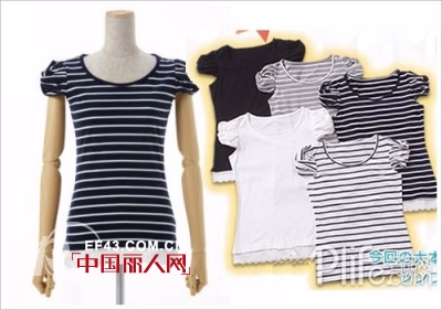 这是一款最常见的T恤,褶皱泡泡袖的设计和下摆的蕾丝花边是它的不寻常之处,黑白色和条纹图案都是很百搭的款式。