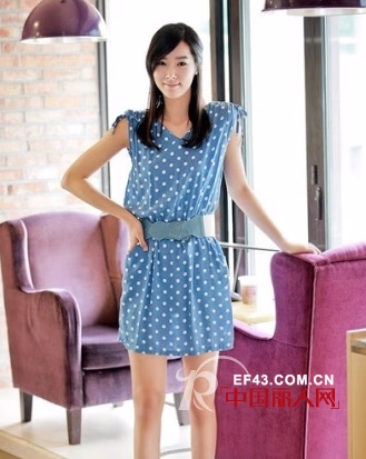 蓝色波点裙装甜美中带着大方的感觉,肩膀处的系带设计带来一抹俏皮感。同色系的宽腰带为柔软的裙子带来利落的感觉,并且勾勒出腰身曲线。
