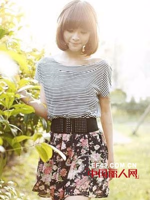 上半身的条纹是针织面料,下半身的绚烂印花是飘逸的雪纺。两者的对撞,耳目一新的条纹甜心装,将你从芸芸众生中完美搭救!