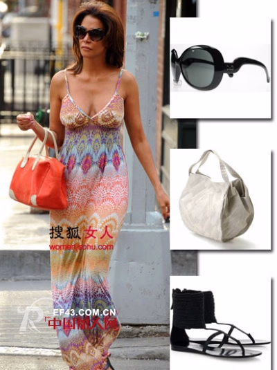 本身这条五彩印花长裙,不论是颜色还是图案都给人清新的感觉,在这个30杜的高温天中,是再好不过了!橘色拎包很抢眼!