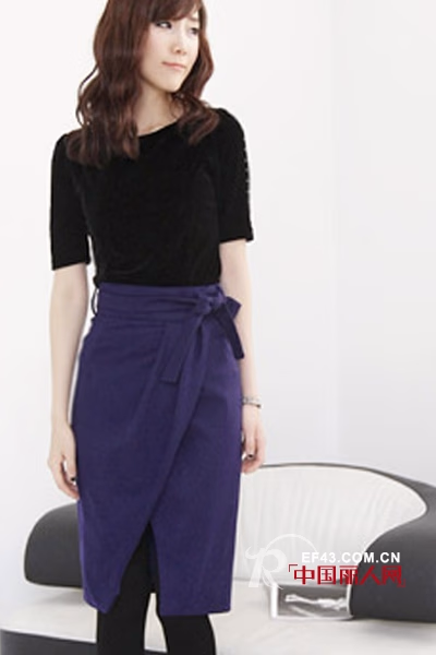 深灰/青莲色A字裙,简约大方,高腰的设计轻易地掩饰了小肚子的存在,而且把腰线提高,从整体上拉高了身段。同色的腰带丰富了腰部的视觉效果。正面裙摆开衩处理,如同郁金香花朵型的裹裙。