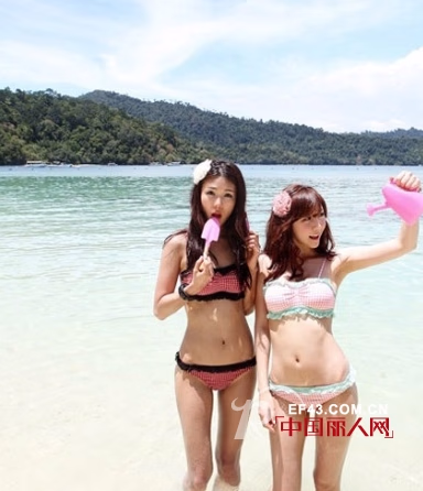 湖蓝色BIKINI上的撞色碎花圆润了胸型,四分之三的杯形立刻让罩杯从A升到C,四分之一的差别让乳沟立现。外搭的白色TOP瞬间夺去了腰间小肉肉的镜头。