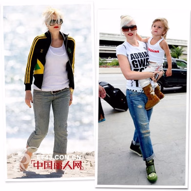 作为两个孩子的妈妈,Gwen Stefani(格温·史蒂芬尼)喜欢的是那些穿起来特别舒适的上衣,而且牛仔裤一直都是她钟爱的单品。这位流行歌坛的歌星最喜欢和牛仔裤搭配的有T恤、夹克、背心,为了让形象更加时尚前卫,她会选择一些另类的配饰,比方是酷酷的太阳镜和个性的鞋子。