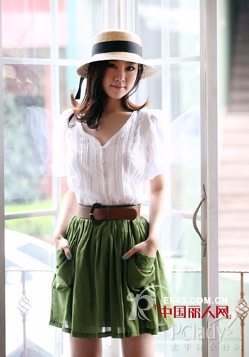 编辑点评:轻薄的材质,小裙摆也可以展现飘逸感,搭白色小压褶白衬衫,棕色皮带提升半身裙的腰线,让身材变得修长。绿色细高跟鞋展现熟女风情。