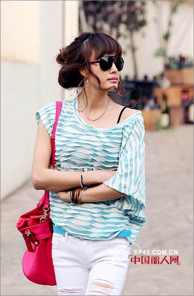 时尚解析:条纹蝙蝠衫不规则的图案让视觉忽视身材的不足,袖子长短不一的设计更是富有个性,不仅遮住麒麟臂,还让肩膀更加窄小轻薄。