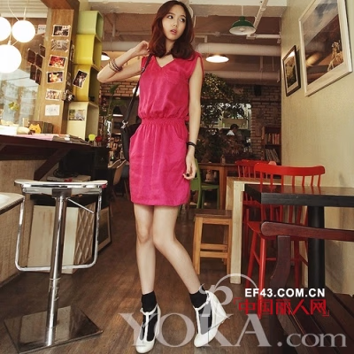 玫瑰红色的优雅连衣裙,纯色设计,款式简洁大方,很有优雅女人味儿!柔软的棉材质,穿着舒适轻便,清新的色调,让气色看起来超级好,前后均为V领,后身纽扣设计增添可爱味道,穿上它,office里你一定最耀眼!
