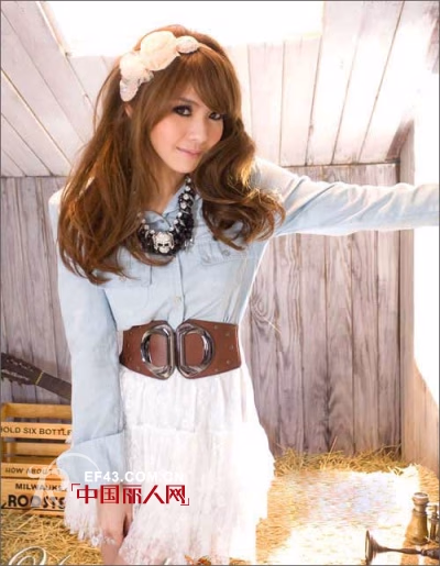 牛仔布衬衣搭配蕾丝纯白小纱裙,腰间系上宽款皮带,高腰处理拉长美腿提高腰线,搭配任何夸张的首饰都能显示出野性的牛仔风。