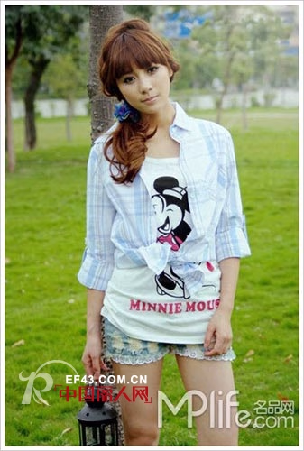 可爱的米奇搭上蕾丝边牛仔短裤,清爽的衬衫在腰间系上一个美丽的蝴蝶结,妖娆的小蛮腰修饰的更加纤细。