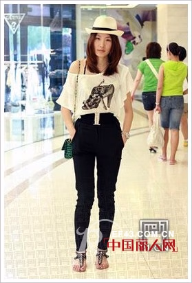 高腰的萝卜裤搭配宽松露肩上衣,复古中透着小性感。