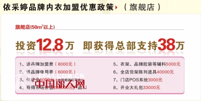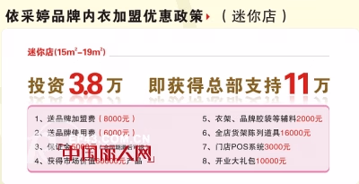 依采婷品牌内衣连锁店2005年3月份开设第一家自营店,秉承全新的形象,时尚化的商品定位、人性化的经营风格、规范化的服务水准,完善的货品,大众化的价格,严格的管理理念,务实、节约、高效、创新,在强手如林的商业竞争中不断焕发青春活力,取得了骄人的成绩;我们拥有自己的连锁加盟专营店和分销渠道,自开创品牌以来,一直秉承专业、专心、创新、贴心服务大众的经营理念,本着诚实、注重品质、熟谙客户需求的服务意识,公司在短短的半年之内,迅速抢占市场。发展加盟连锁店近几十家,形成了立足东莞,遍布广东,影响全国的战略格局。