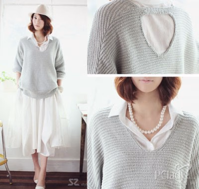 这款针织衫在设计上与前一款非常相似。淡淡的蓝色,V领,宽松的版型,独特之处也同样在背部。在颈部正下方的部分,挖出一个心型,独具匠心的设计让这款针织衫与众不同。搭配一件白色衬衫和一条白色长裙,让你既甜美,又个性。