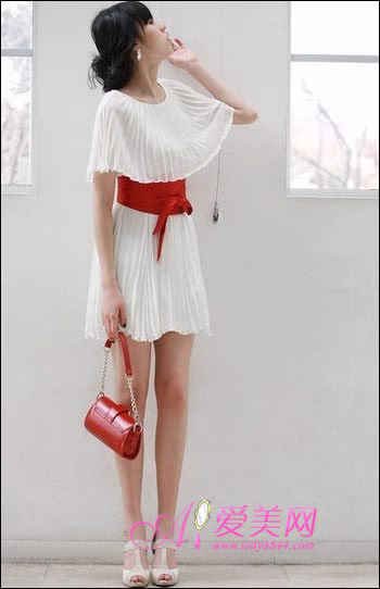 白色总是纯洁的象征,此款扇形裙装,表现出的不仅仅是清纯,更多的是女性的优雅,中间的红的宽腰带,起到收腰作用。