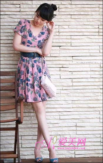 缤纷斑斓的短裙,露出修长的腿部,再加上一件粉嫩的针织衫,谁都无法抵挡的甜美。粉色和大花的裙装搭配很是出彩,建议皮肤白的MM一定要试试。