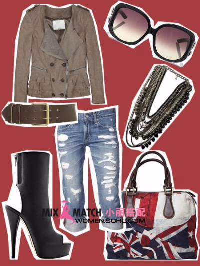 搭配建议:宽领双排扣夹克搭配破洞翻边仔裤,这个春天,犀利风盛行,这个当然必备不可少。国旗手袋的搭配非常抢眼。