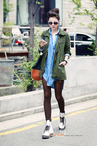 时尚点评:蓝色的长款衬衫当one-piece穿,黑色的丝袜增加层次感,也让整个偏中性的搭配变得女人味起来哦。军绿色的外套剪裁宽松,搭配宽松的衬衫正好看,一双白色的运动鞋非常帅气,是今年秋冬的大热款!