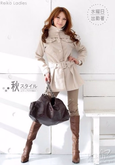 2010春装搭配图片:保暖系最佳搭配外套,立领的毛呢外套成就利落有型的美人。立领添加了利落感让毛呢外套让整体更加有型好看,双肩的设计也让外套变的更加立体,腰部的绑带有修饰腰间曲线的效果。